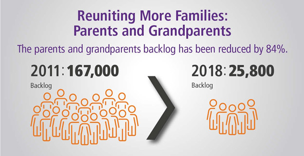 因为有关父母和祖父母团聚(PGP)类别持续处于高需求状态,联邦移民部再次上调申请配额,同时缩减了以往积压的申请。目前,积压的申请个案已经从2011年的167,000人下降到2018年6月的25,800人。