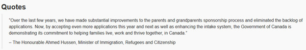 保守党执政期间,父母/祖父母家庭团聚移民因年度配额少、审批慢等各种原因,积压个案越来越多。自由党政府上台后,积极解决各种移民难题,增加名额;此外,将保守党实行的“名额先到先得”原则申请方式,改为“随机抽签”模式。
