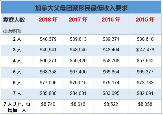 请参考2015-2018年的收入要求(父母团聚收入为最低收入LICO 的1.3倍):