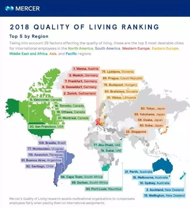 比如Mercer’ssurvey的2018年全球宜居城市排名